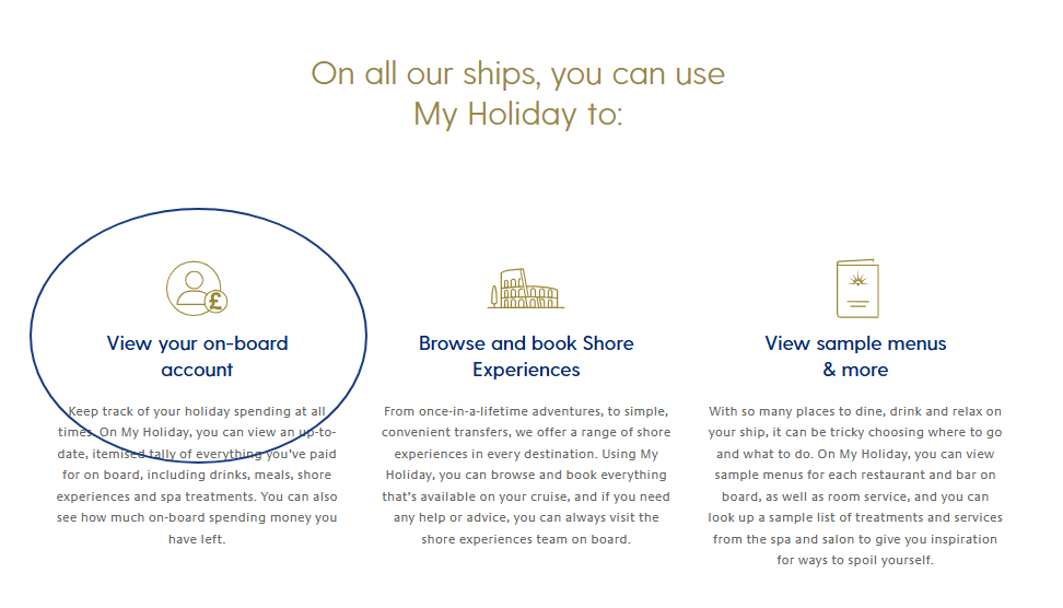 - Using the My Holiday online portal: You’ll have access to an on-board portal that allows you to check your on-board statement, as well as other things. Simply log in to My Holiday and click ‘On-board account’ to see a breakdown of your on-board spending.