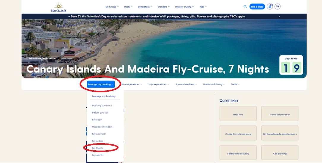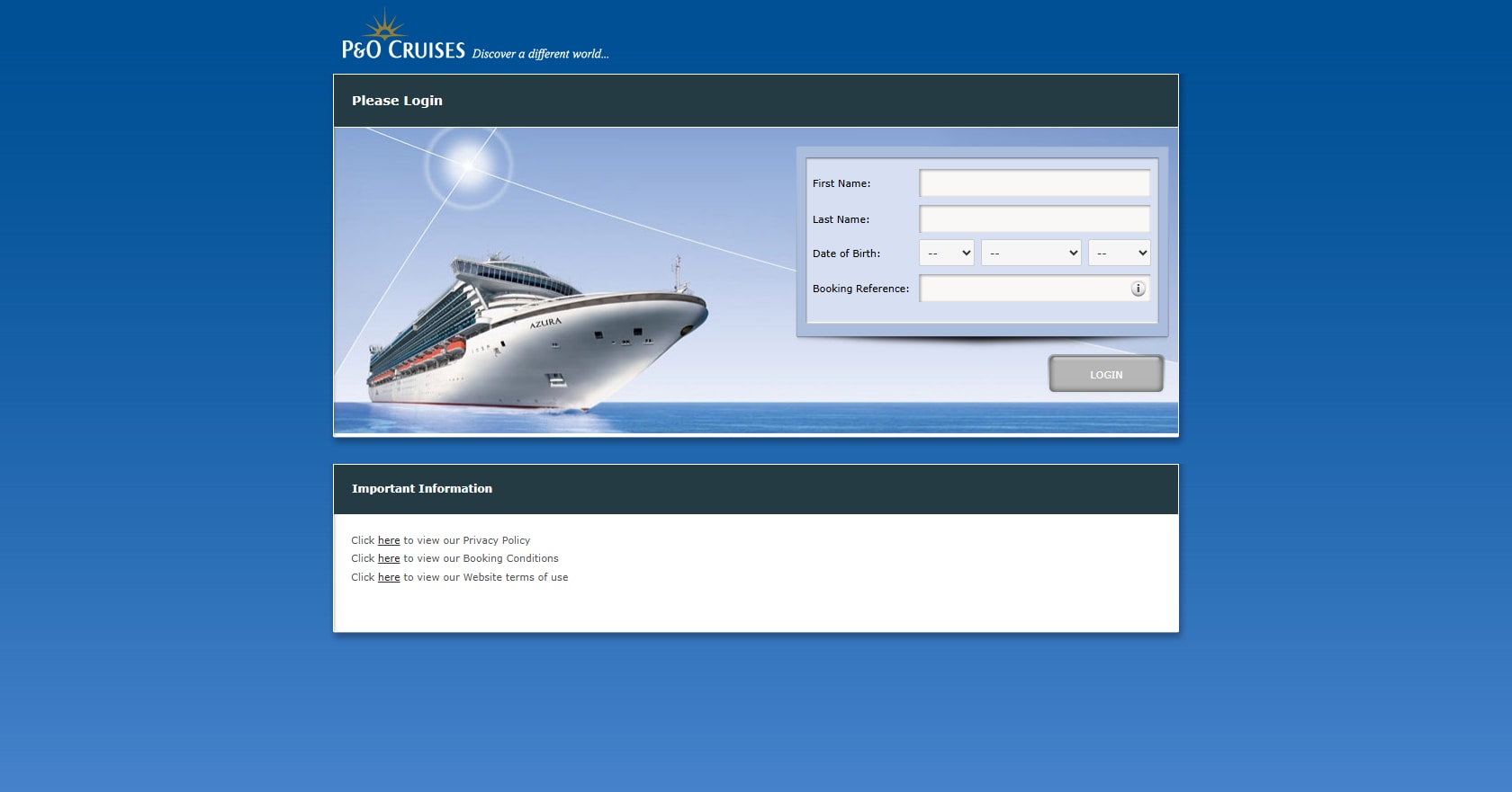 - Log in to My P&O Cruises using your first name, last name, date of birth and P&O Cruises booking reference (you’ll find this on your booking confirmation)